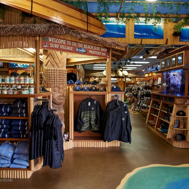 The shop is almost 6,000 square feet in size and it has a tropical theme - bamboo everywhere, Tiki huts filled with clothes, beach sand mixed into the floor, and classic surfboards.
