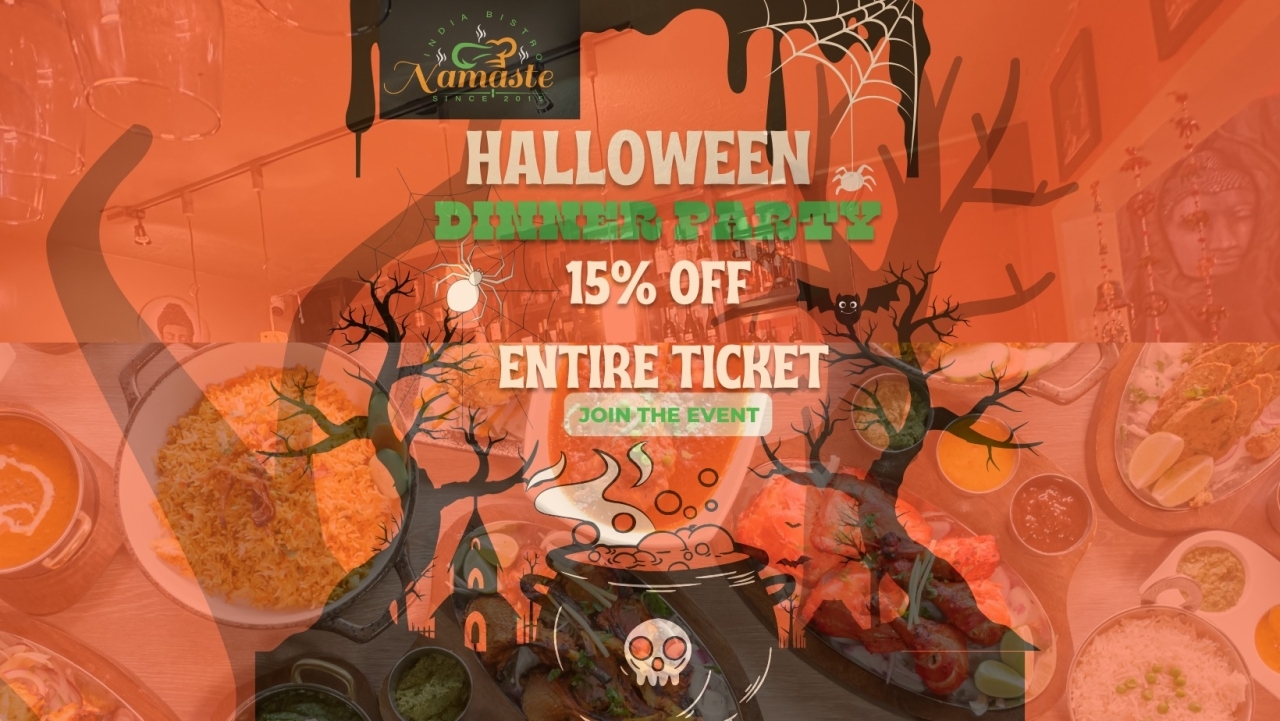 Join us for a hauntingly good time at Namaste India Bistro! This Halloween, we're cooking up a ghoulishly delicious dinner party just for you, 5pm-8:30pm, featuring great food, delightful company, and some fun surprises.