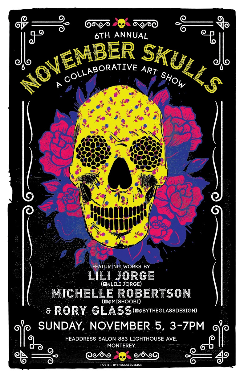 Headdress Salon presents our annual collaborative art show, November Skulls, featuring work by Heather Jorgensen (a.k.a. Lili Jorge), Michelle Robertson, and Rory Glass, on Sunday, November 5, 3pm-7pm. Come celebrate life, art, and community! All art work is for sale.