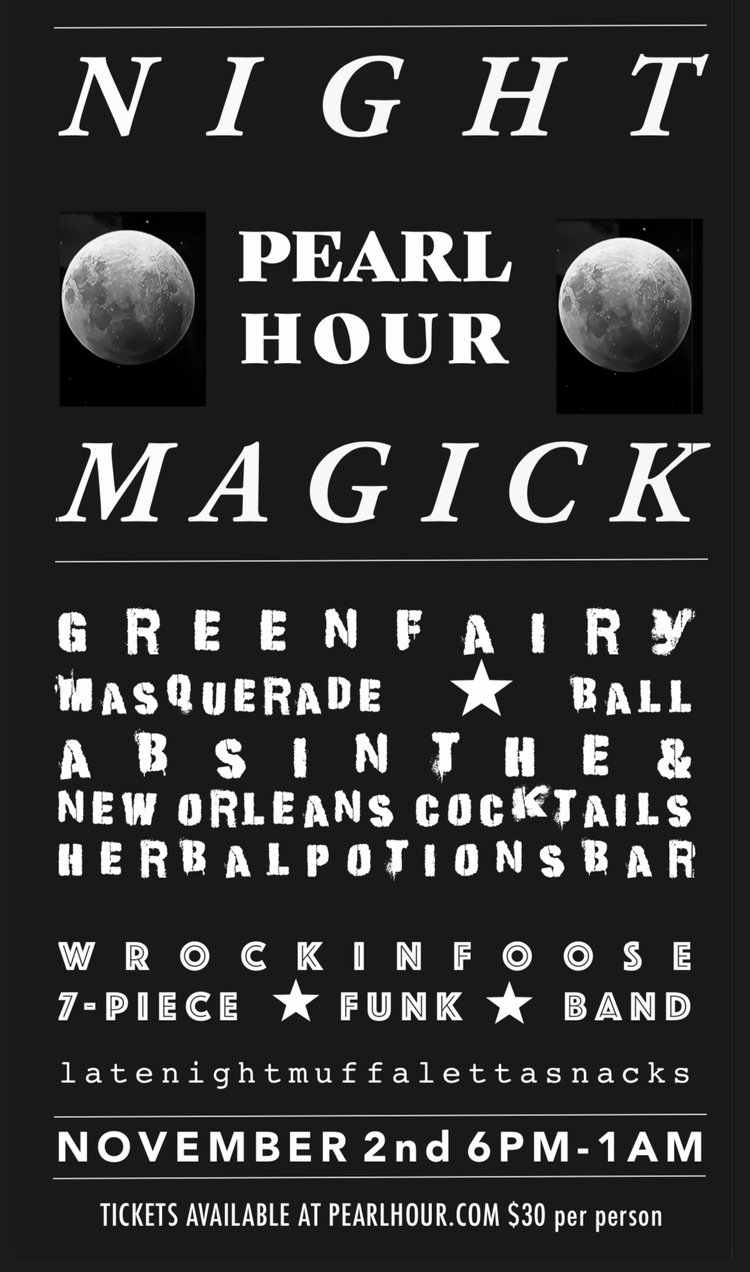 Pearl Hour presents Night Magick, a Masquerade Ball, on Saturday, November 2, 6pm-1am. Enjoy live music, a special drink menu, and a late night snack.