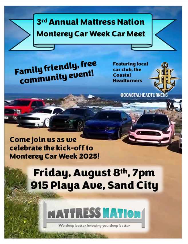 The Lighthouse District's own Mattress Nation Salesperson, Laura, is coordinating a free Car Week Car Meet at the Mattress Nation location in Sand City on Friday, August 8 at 7pm. This is a family-friendly community event and all are welcome!