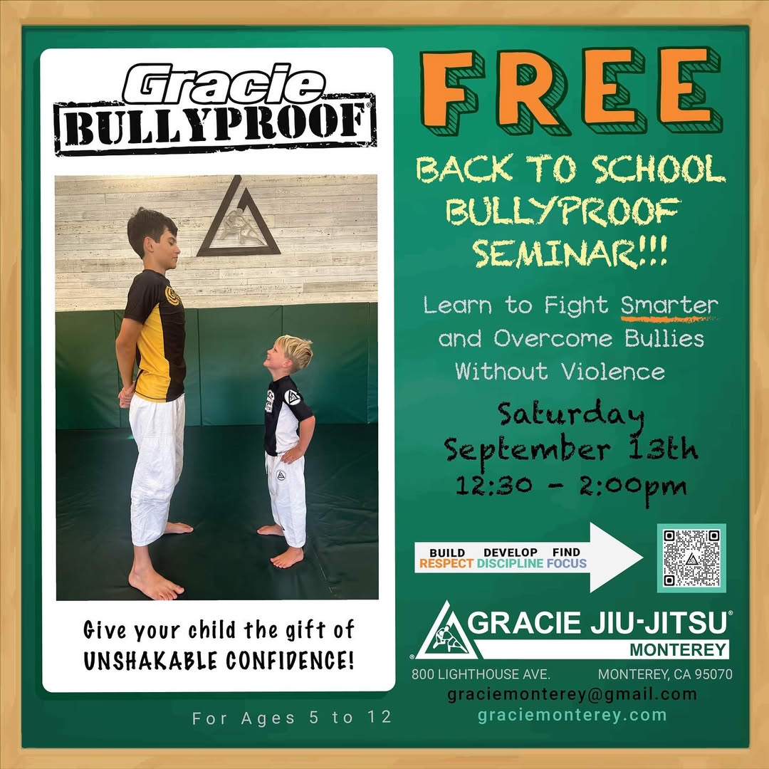 Gracie Jiu-Jitsu Monterey presents a free Back to School Bullyproof Seminar for children ages 6-12 on Saturday, September 13, 12:30pm-2pm. No prior experience or knowledge is necessary. Register here.