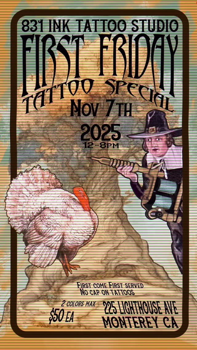 831 INK offers a tattoo special on the first Friday of every month, 2pm-8pm. Tattoos are first come, first served (no trading sign ins). No cap on tattoos per person, $50 each. We'll have a lot of designs to choose from.