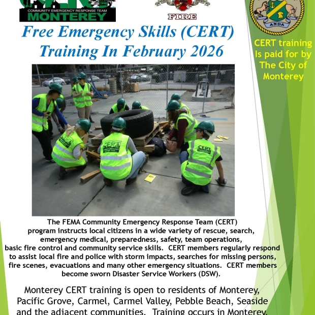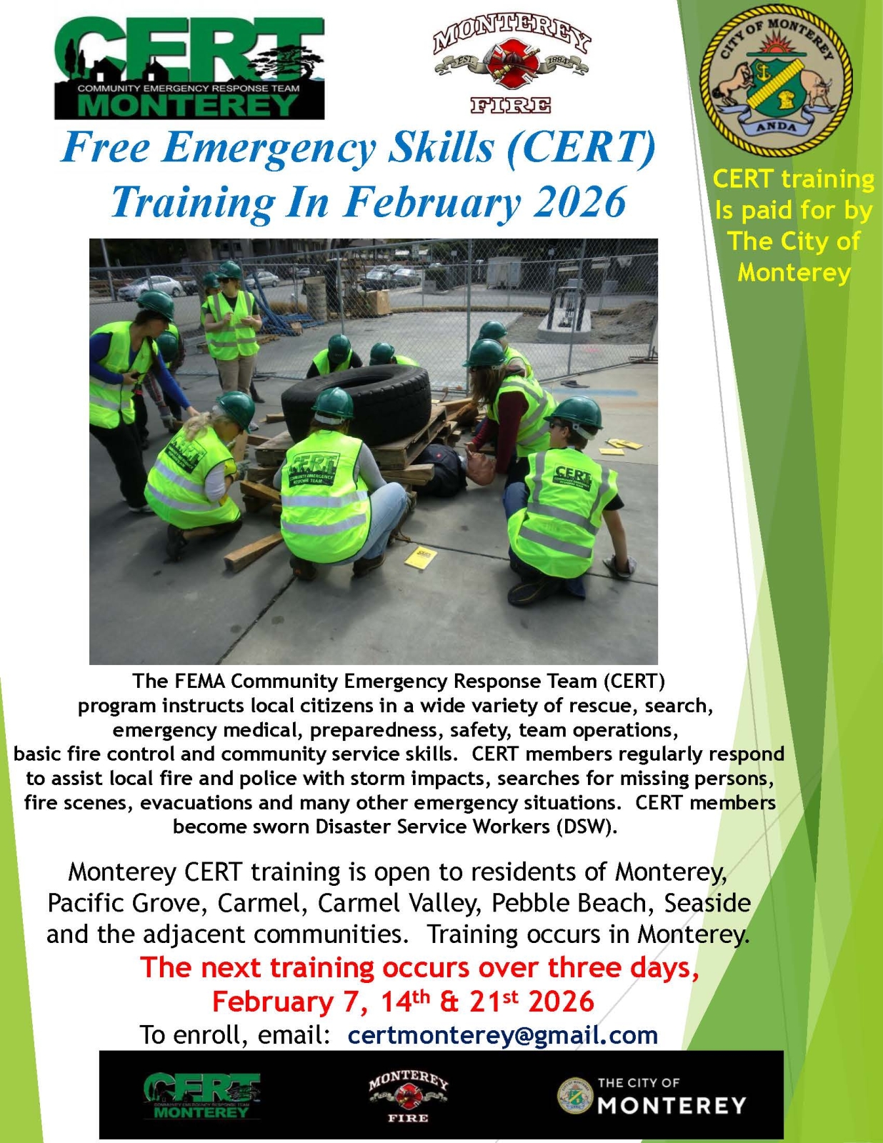 The next free Community Emergency Response Team (CERT) training program begins in Downtown Monterey on February 7, 2026.