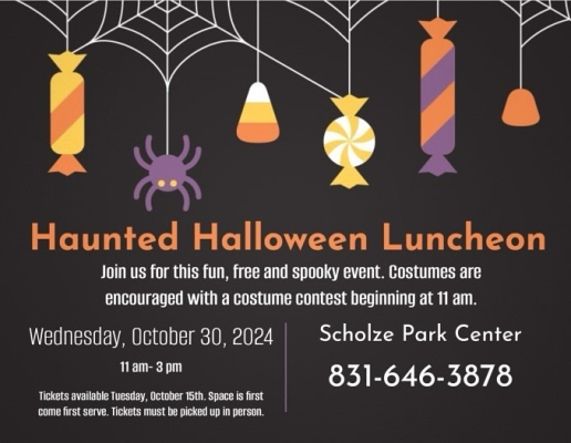 Scholze Park Community Center is hosting a Haunted Halloween Luncheon for adults! Costumes are encouraged. The costume contest will begin at 11am, then you'll enjoy a free catered luncheon and live music by Mike Noonan. Tickets available at Scholze Park Center.